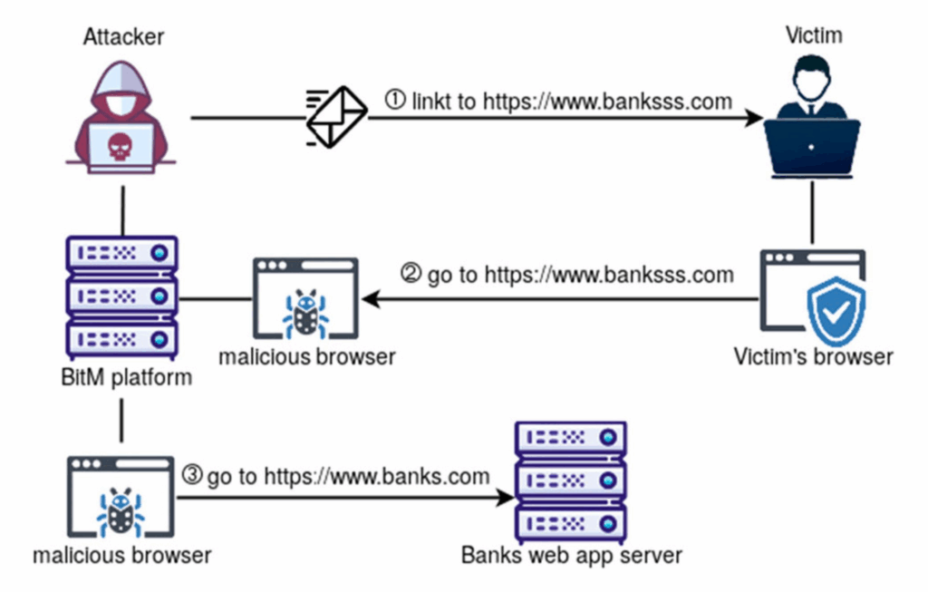 Тех­ника «бра­узер посере­дине» осно­вана на интегра­ции инфраструк­туры ата­кующе­го в соеди­нение меж­ду бра­узе­ром жер­твы и целевым веб‑при­ложе­нием. Как толь­ко жер­тва перей­дет по фишин­говой ссыл­ке, ата­кующий нап­равит ее бра­узер на свою плат­форму, которая будет перенап­равлять все зап­росы к ори­гиналь­ному веб‑ресур­су. И заод­но перех­ватывать дан­ные в этом соеди­нении.